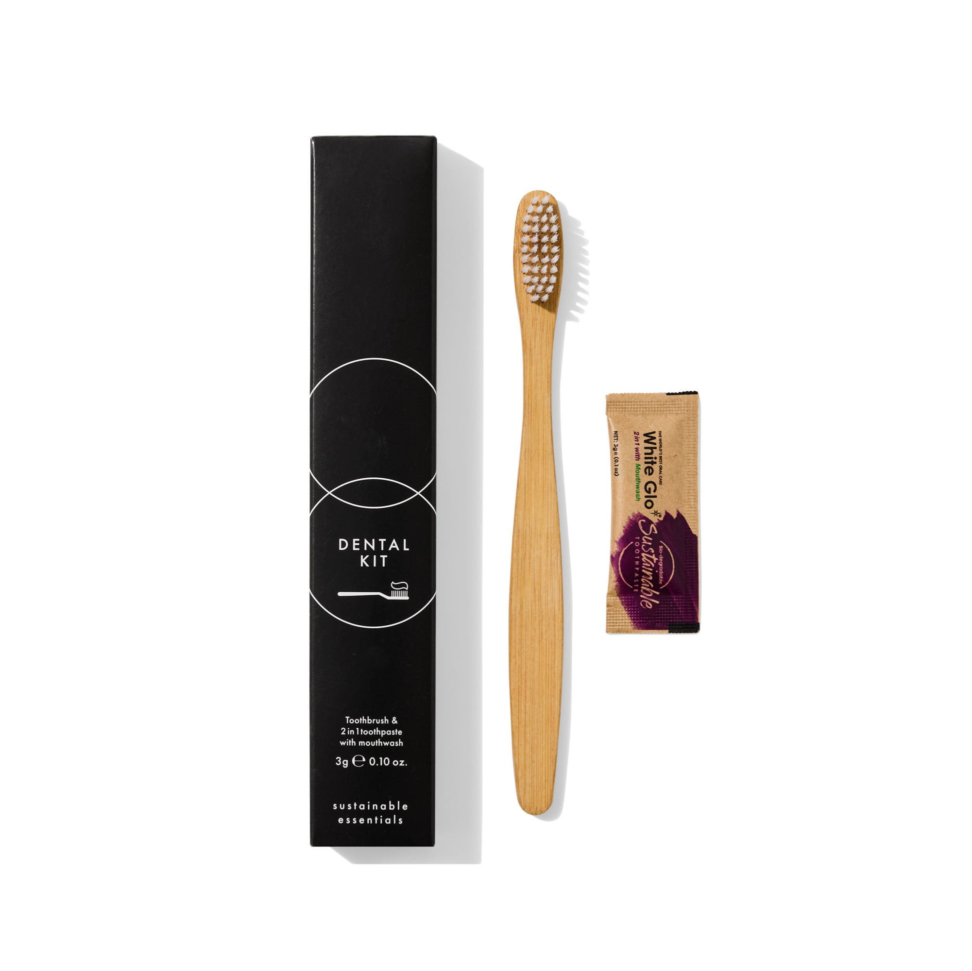 - Kraft Dental Kits: A toothbrush with handle crafted from bamboo and travel size toothpaste, packed in kraft paper.